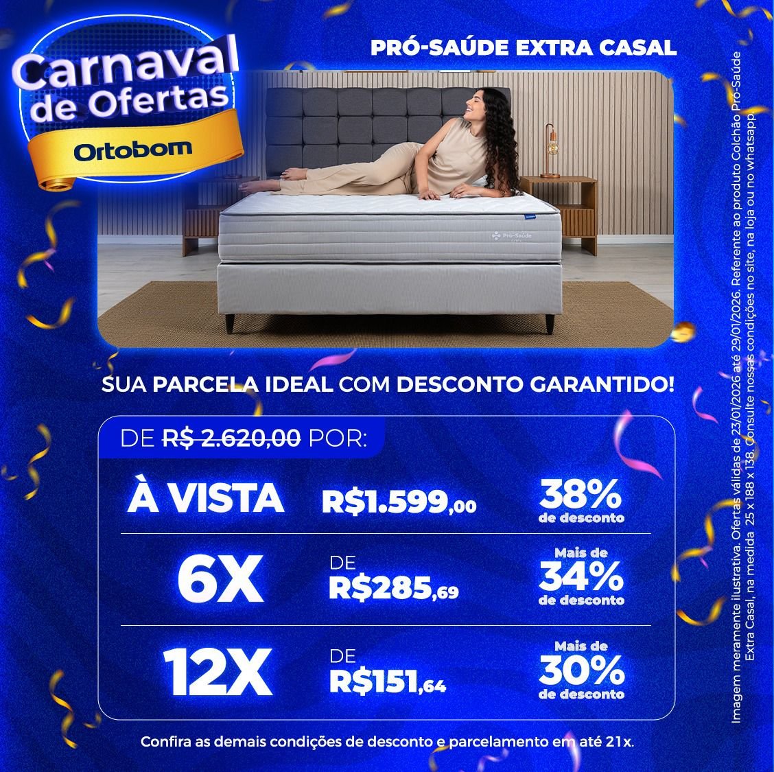 As promoções da Ortobom Abraão de Morais são pensadas para quem busca qualidade de sono, conforto e segurança na compra. As condições variam conforme o modelo, tamanho e disponibilidade em loja, garantindo o melhor ajuste para cada necessidade.